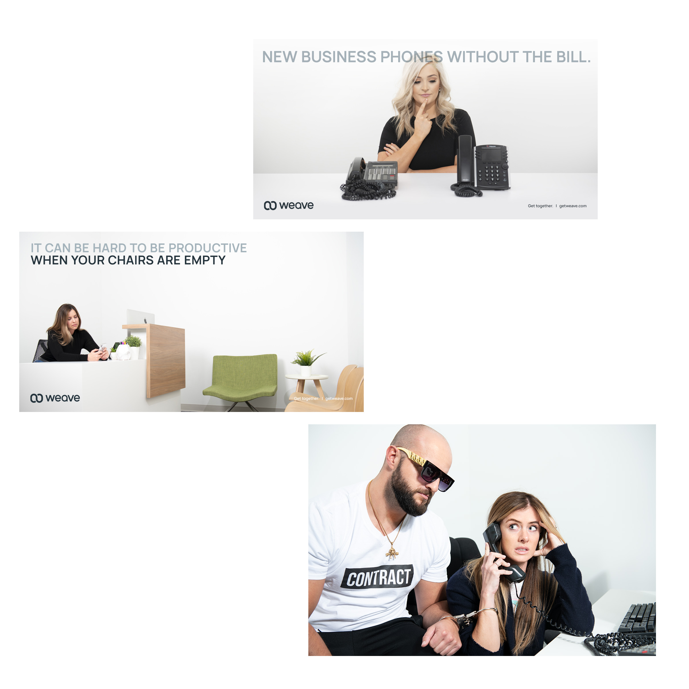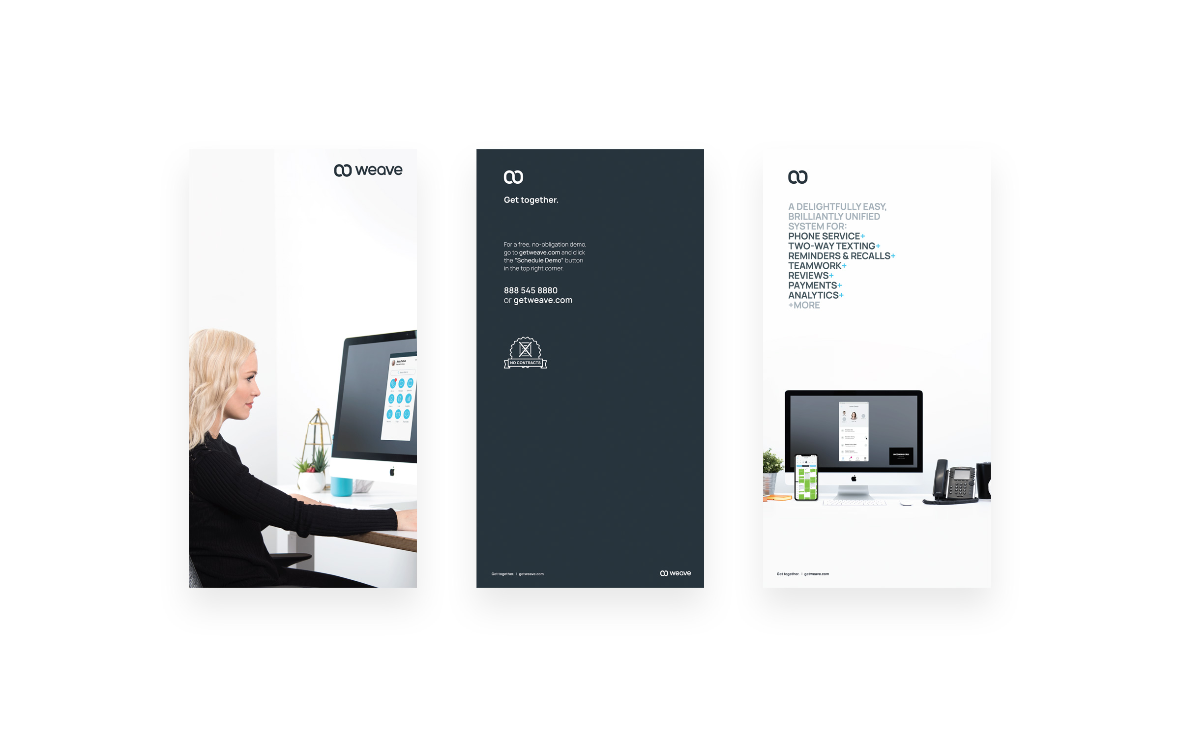 As Creative Director for Weave, I was responsible for the overall visual representation of the brand, as well as forming and championing it's guiding intent: To be percieved as Premium + Approachable. As part of defining the brand, I designed the Weave logo (which represents unity & possibility), collateral, advertisements (digital and print), campaign initiaves for digital marketing, events, photography, video, social media and internal cultural branding, among other things.